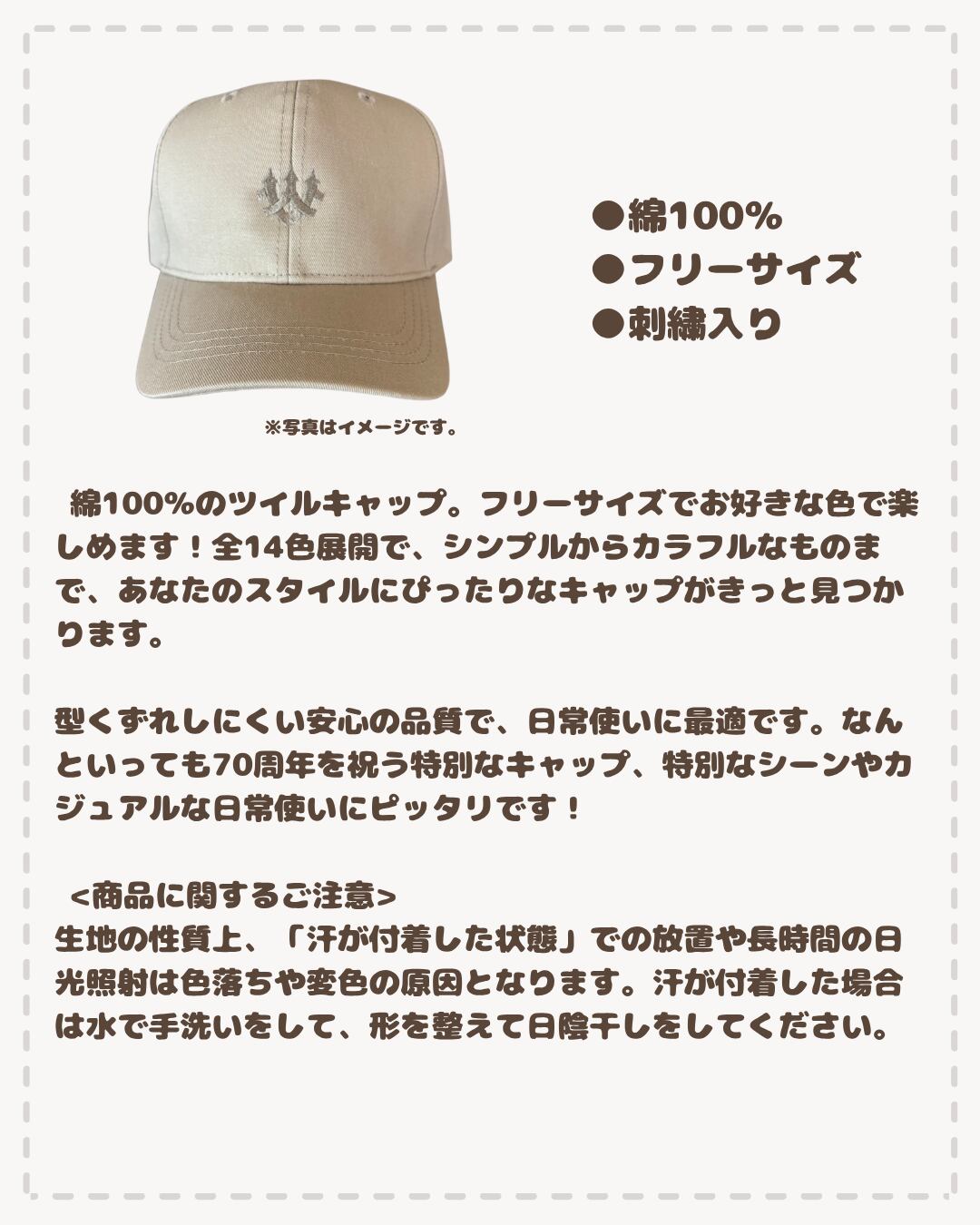 綿100%のツイルキャップ。フリーサイズでお好きな色で楽しめます。